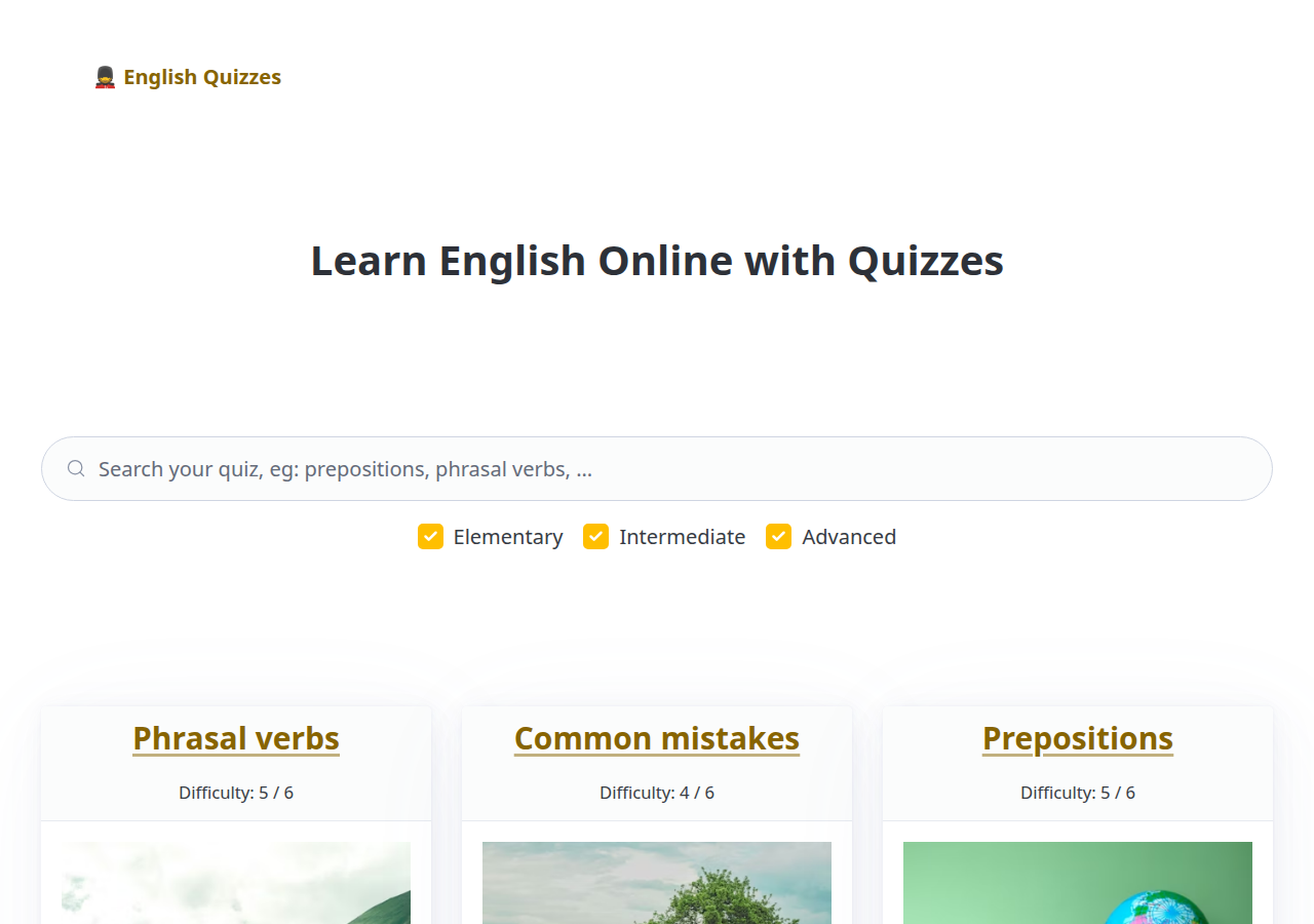 Want to improve your English skills in an engaging way? In this site youβll find interactive English quizzes covering grammar, vocabulary, reading comprehension, and more. Practice with quizzesand get instant feedback and explanations to improve faster!
